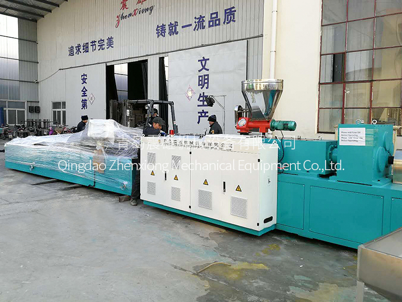 1 conical twin screw extruder 2 vacuum setting table 3 shaped crawler tractor 4 automatic film machine 5 automatic cutting machine 6 flip table